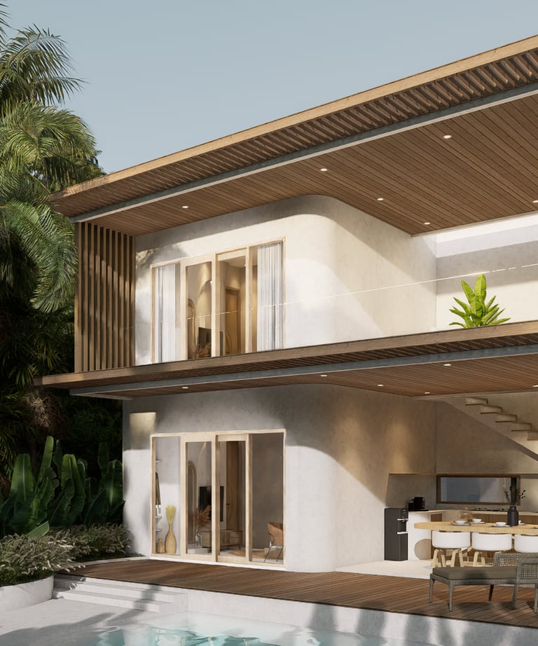 80–90 m² – Open plan interiors with private pool and tropical concept.